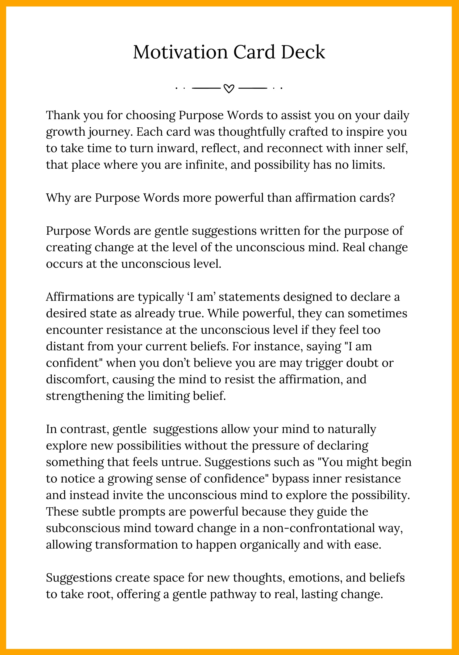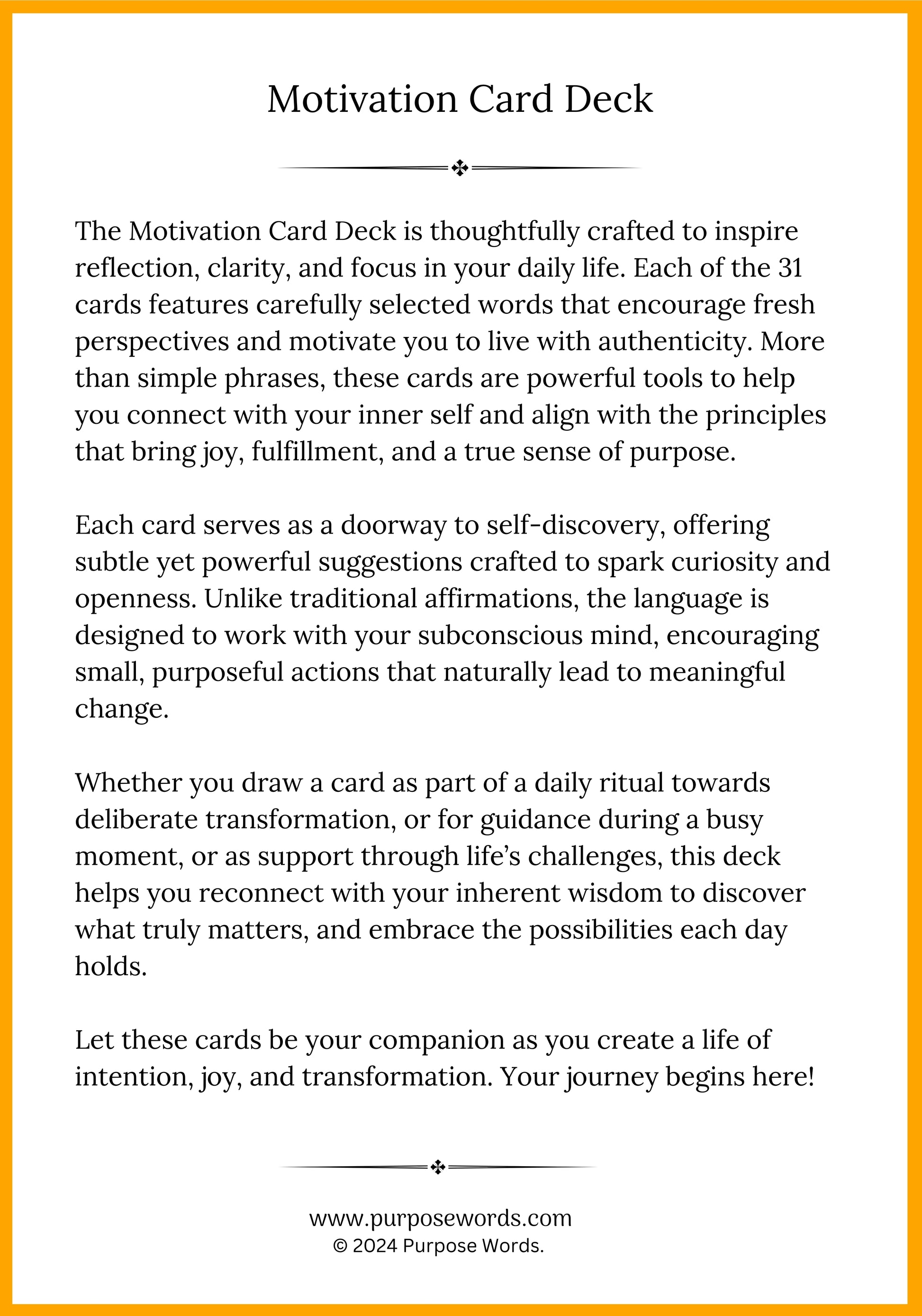 Transform your day with the Purpose Words Motivation Card Deck, a beautifully crafted tool designed to bring focus, motivation, and mindfulness into your life. Purpose Words work with the unconscious mind to create sublet and meaningful change.